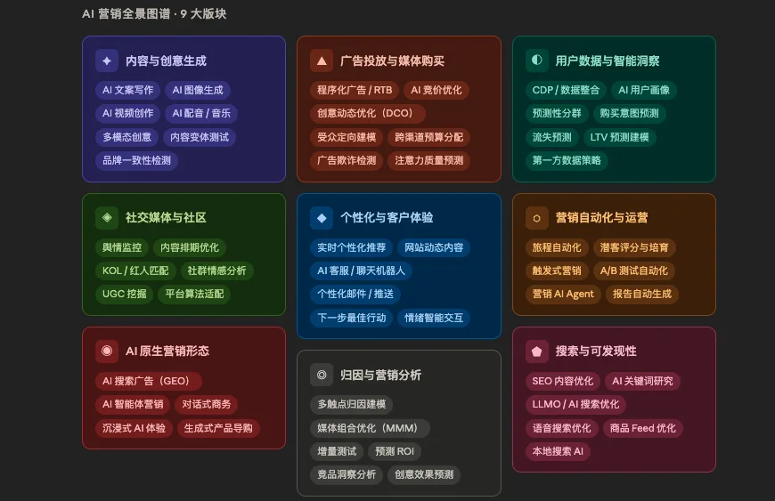 AI营销的9大核心版块全景梳理:从内容创意生成、广告投放与媒体购买,到用户数据洞察、个性化体验、营销自动化、搜索与GEO、社交社区、归因与营销分析,直达AI原生营销形态。